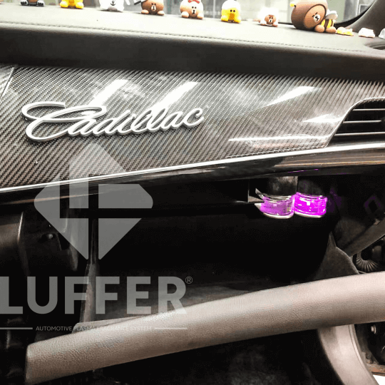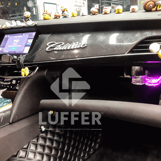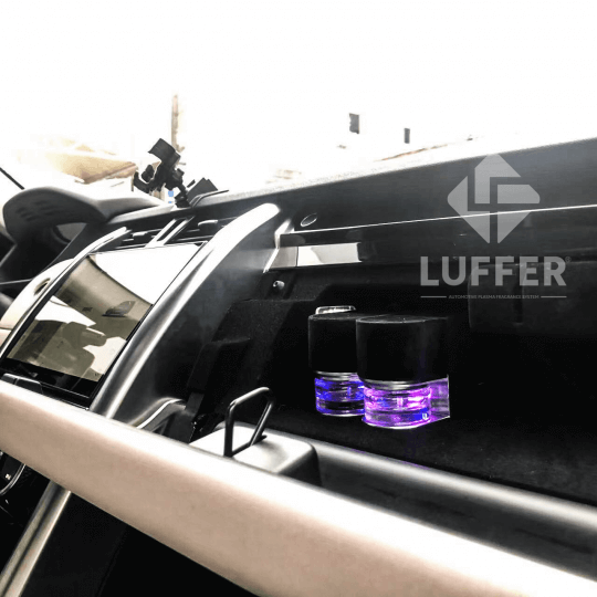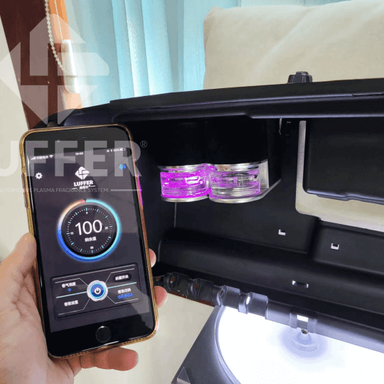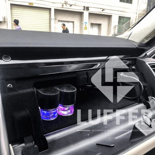 Hình ảnh lắp đặt khuếch tán hương thơm và khử khuẩn xe hơi cao cấp Luffer L11 với bình chứa hương thơm đôi, dễ dàng thay đổi mùi hương trên ứng dụng điện thoại
